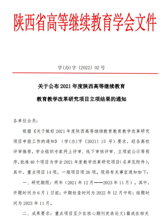 202234日陕西省高等继续教育学会下发《关于公布 2021 年度陕西高等继续教育教育教学改革研究项目立项结果的通知》,我校亚欧语言文化学院杨景老师申报的《基于外语在线开放课程的陕西高等继续教育课程思政建设与实践》成功获批一般项目