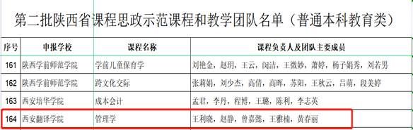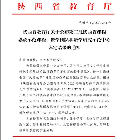 近日,陕西省教育厅公布《第二批陕西省课程思政示范课程、教学团队和教学研究示范中心认定结果的通知》(陕教函〔2023〕264号),我校课程思政教学研究中心获批省级课程思政教学研究示范中心,《管理学》课程项目入选第二批省级课程思政示范课程和教学团队。二批入选的34个陕西省课程思政教学研究示范中心中,全省仅有二所民办高校,我校是其中之一。